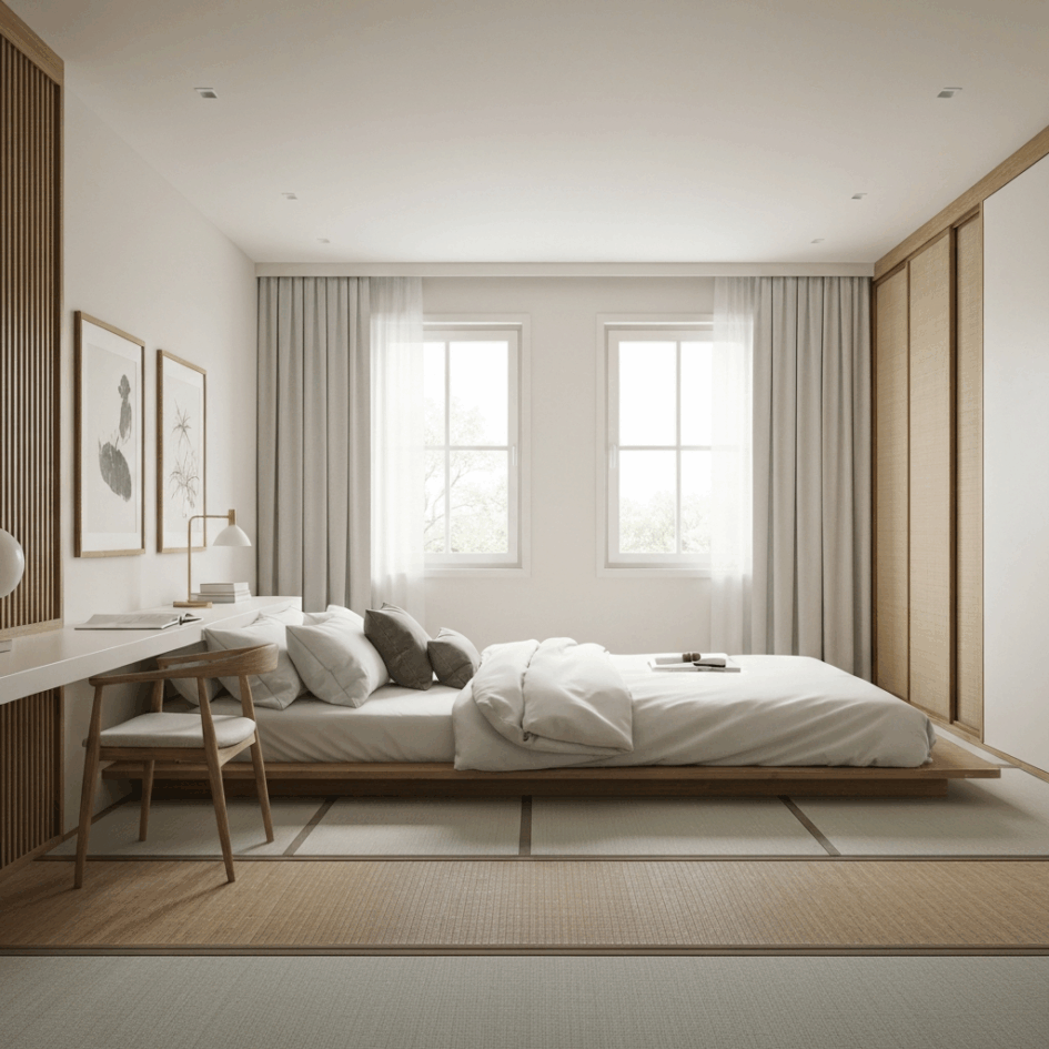 Een Japandi slaapkamer draait om sereniteit, en dat begint met de juiste kleuren. Denk aan een palet van zachte, neutrale en aardse tinten. Gebroken wit, beige, lichtgrijs, zandkleuren en zachte groentinten vormen de perfecte basis. Deze kleuren creëren een gevoel van openheid en kalmte, zonder dat het saai wordt. Het gaat om subtiele verschillen die diepte geven aan je ruimte.