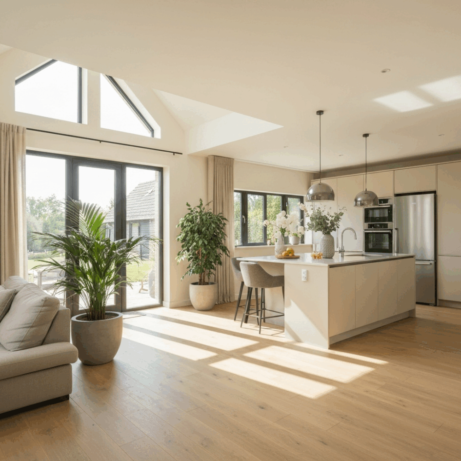 De vloer en wanden bepalen voor een groot deel de sfeer van je nieuwbouw. Een moderne landelijke vloer mag karakter hebben, maar moet tegelijkertijd passen bij de strakke architectuur. Overweeg een brede plankenvloer in een lichte of vergrijsde eik voor een authentieke landelijke basis. Een gietvloer in een warme grijstint of zandkleur kan ook verrassend goed werken, het geeft een strakke maar toch zachte uitstraling. Of denk aan grootformaat tegels met een subtiele betonlook of natuursteen-uitstraling; deze zijn duurzaam en ideaal in combinatie met vloerverwarming.